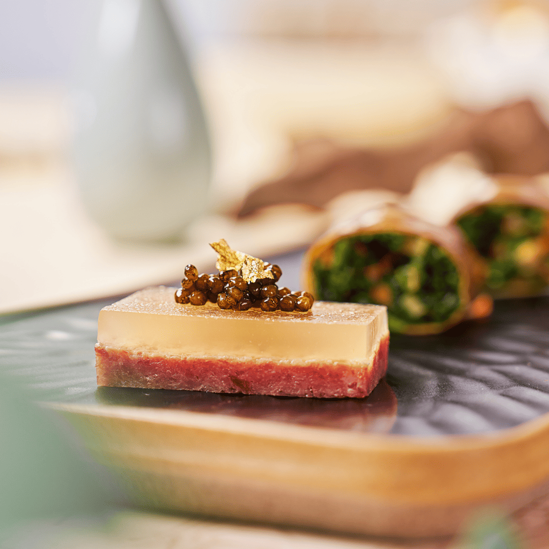 魚子醬水晶肴肉 拼 薺菜煙燻素鵝